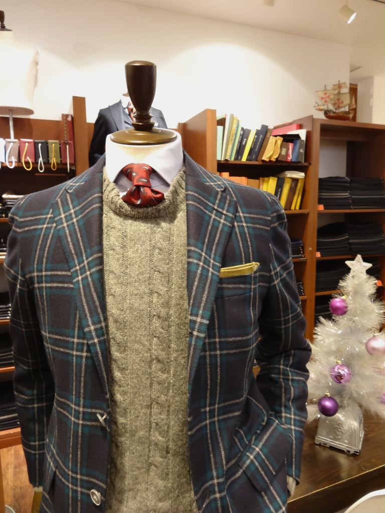 ジャケットのチェックに使われているグリーンとネクタイのレッドで