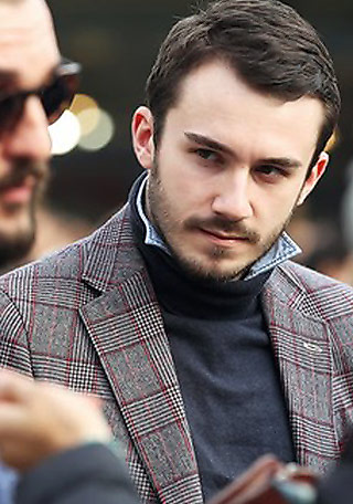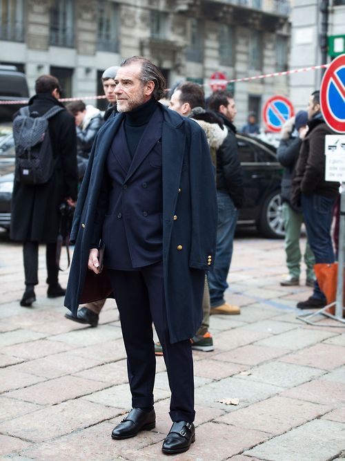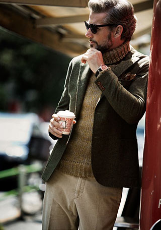 ドレススーツに、あえてやわらかいハイネックのセーターで外しを入れるのが