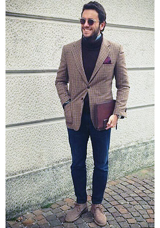 お休みの日に、自慢のジャケットにハイネックセーターを着て、
