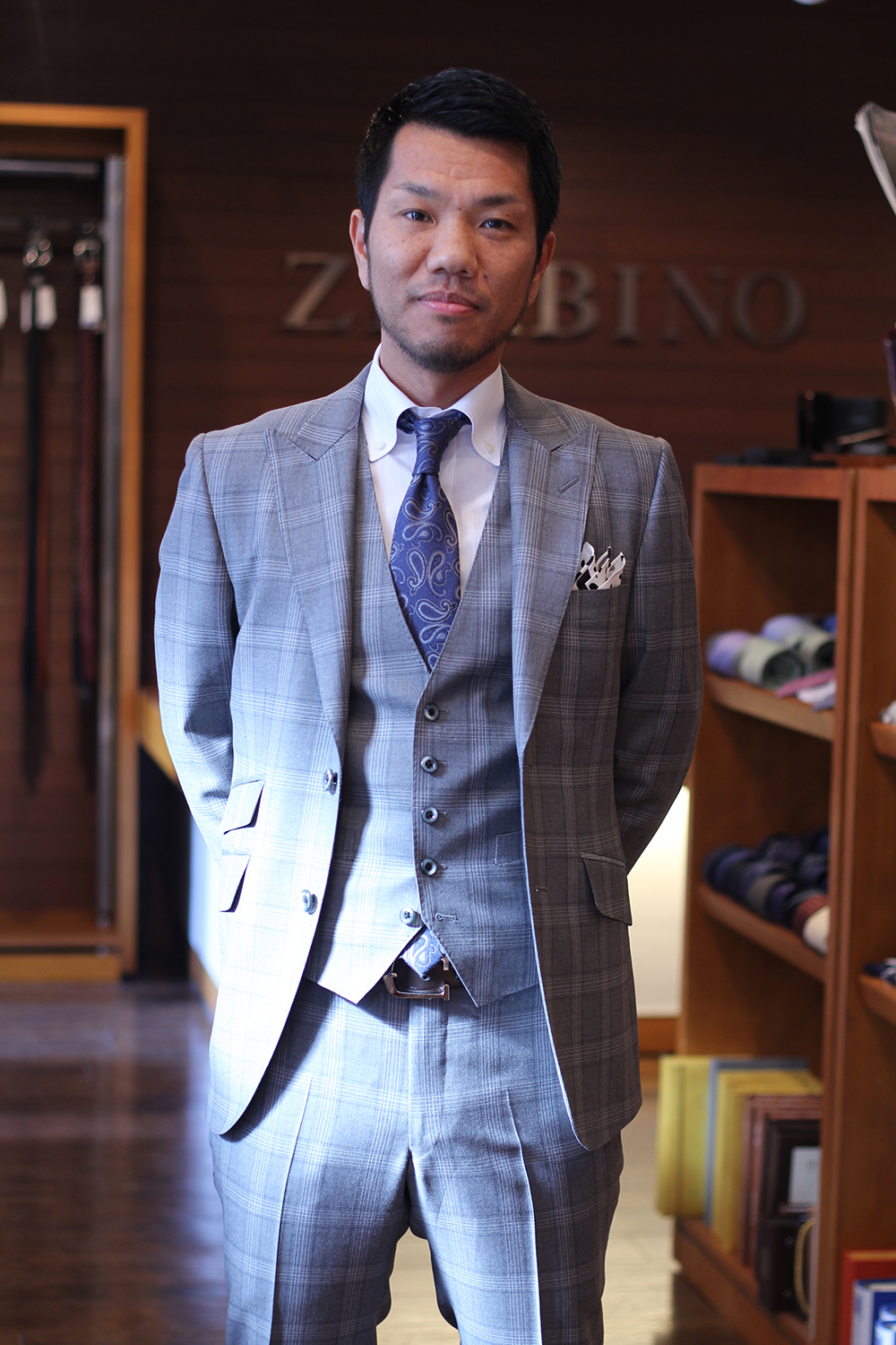 本日は、初挑戦のチェックで3ピーススーツを