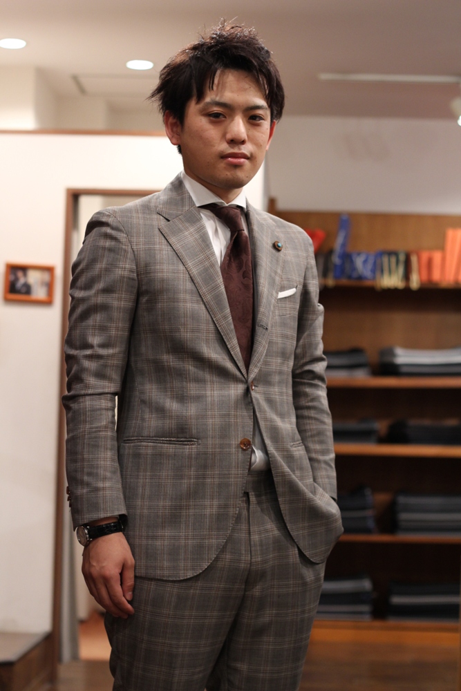 今日は主張強めな、グレーのチェックスーツに、ブラウンのネクタイを合わせました。