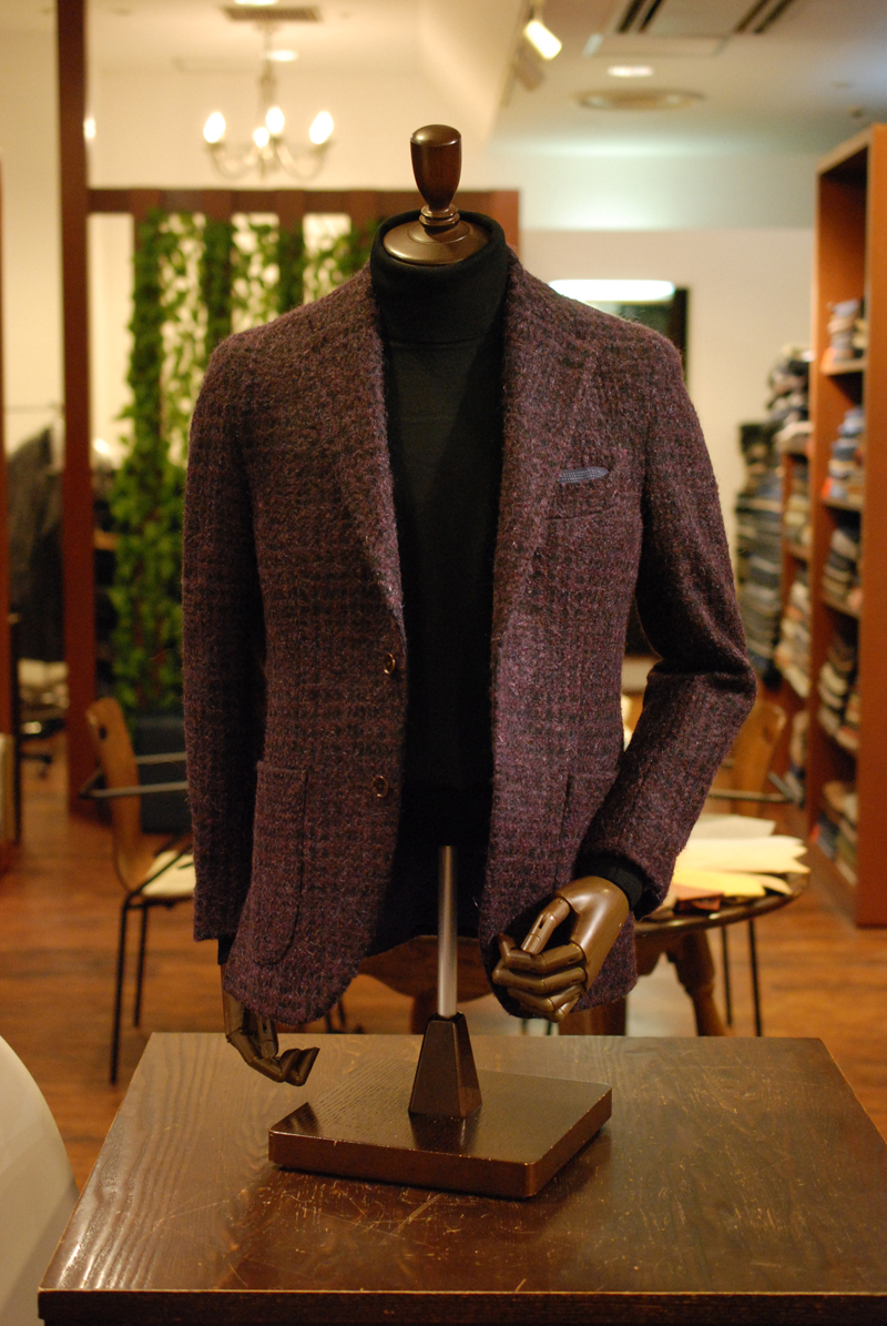 チーフには紺色、ジャケットにはパープルのチェック。