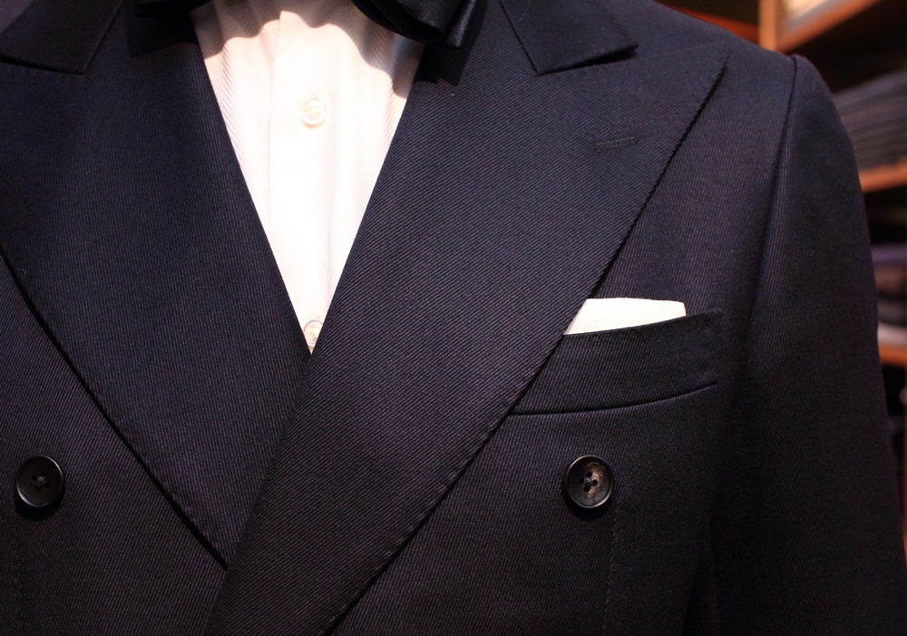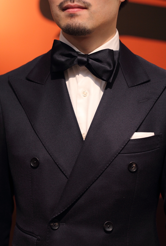 また、ネイビーのダブルスーツ×白シャツ×ボウタイと、