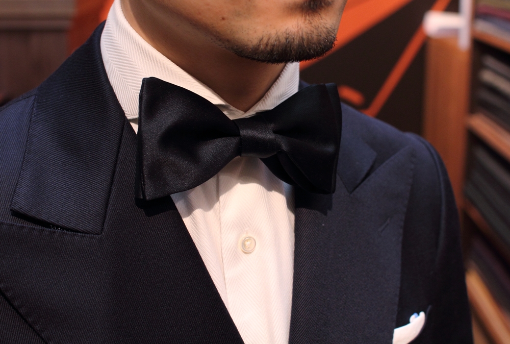 ボウタイはシルク100%でスーツの鈍~い光沢にも負けず劣らず!!