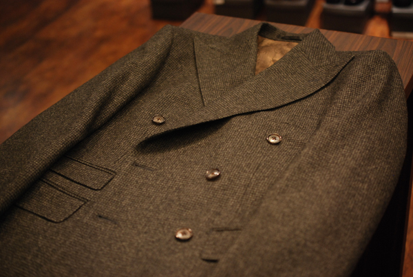 重厚な生地ですが、イタリアらしいシルエットに落とし込むとクラシカルな雰囲気になります。