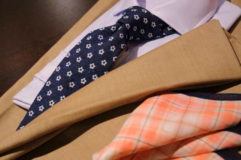 麻チーフで少し素材感を入れるとどちらも楽しめるかと思います。