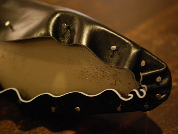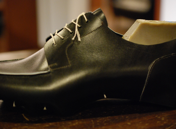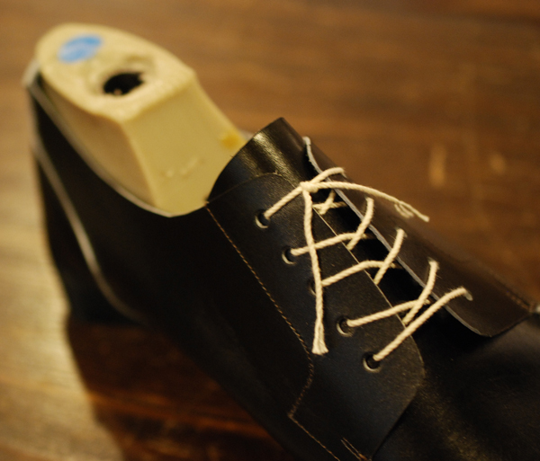 このようにアッパーを手つり込みで木型に仮止めしデザインをチェックします。