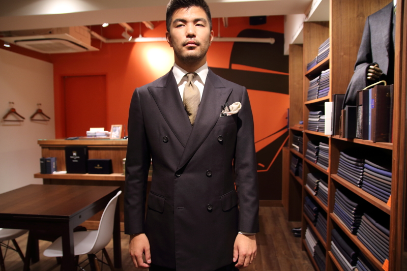 今回のスーツはダブルブレステッド仕立てに
