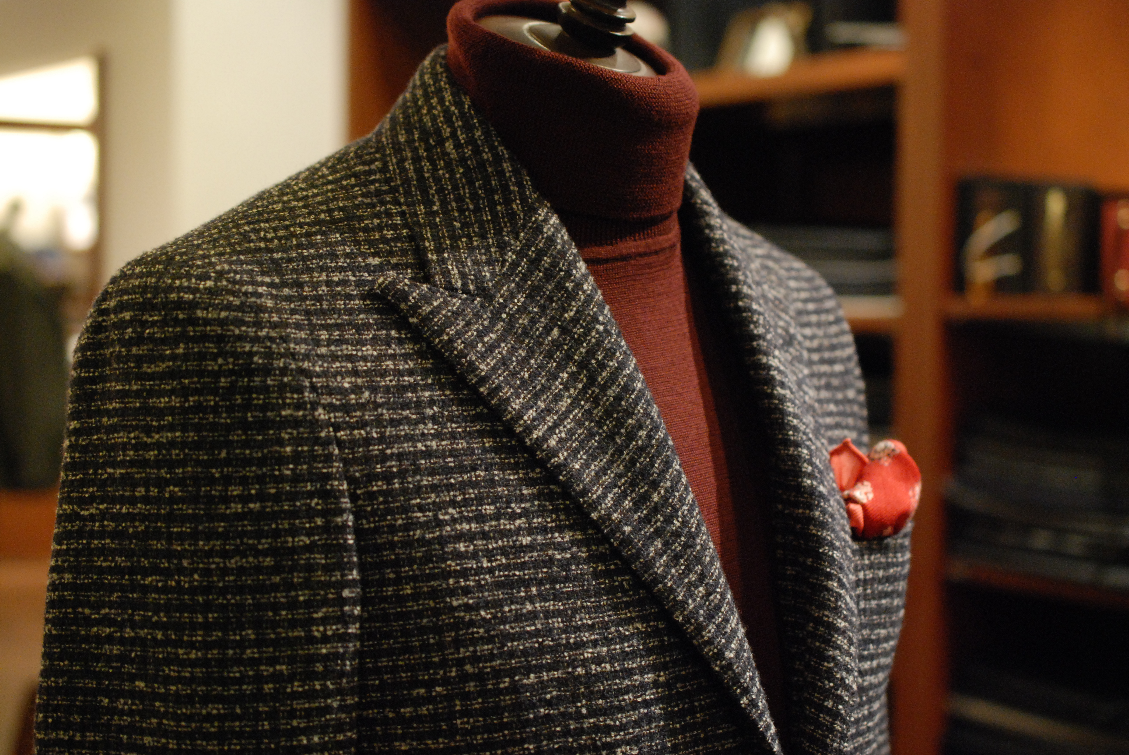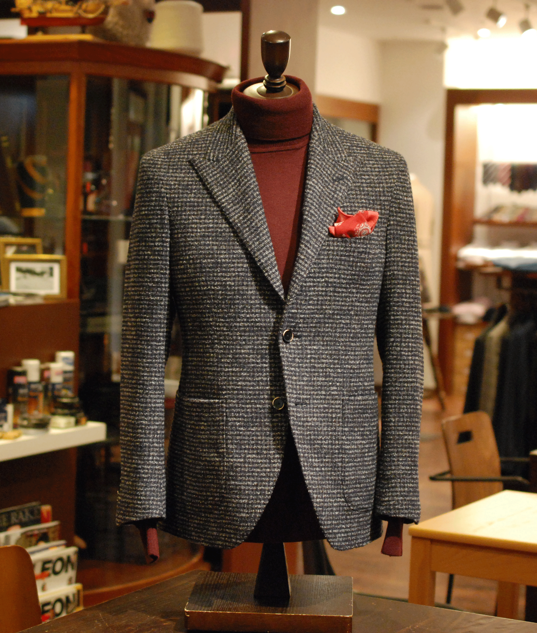 こういった素材感のあるジャケットにピーク襟を合わせるのが今年のおすすめ。