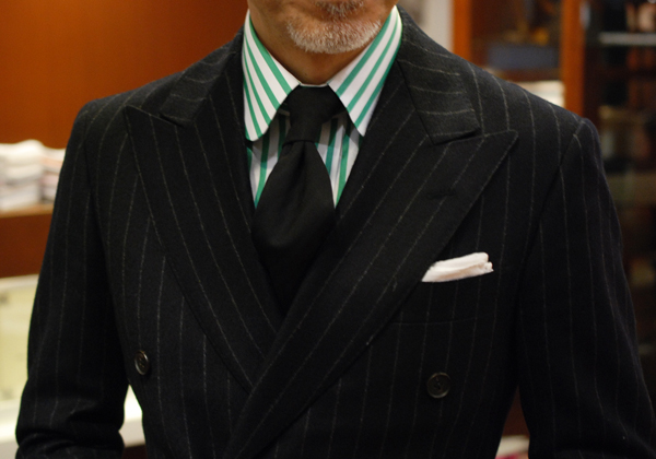 主張が強いように見えますが、定番のネイビーフランネルチョークストライプスーツにも相性が良いです。