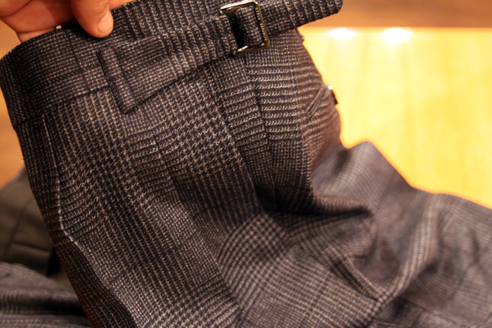 2タックの尾錠付きスラックスと