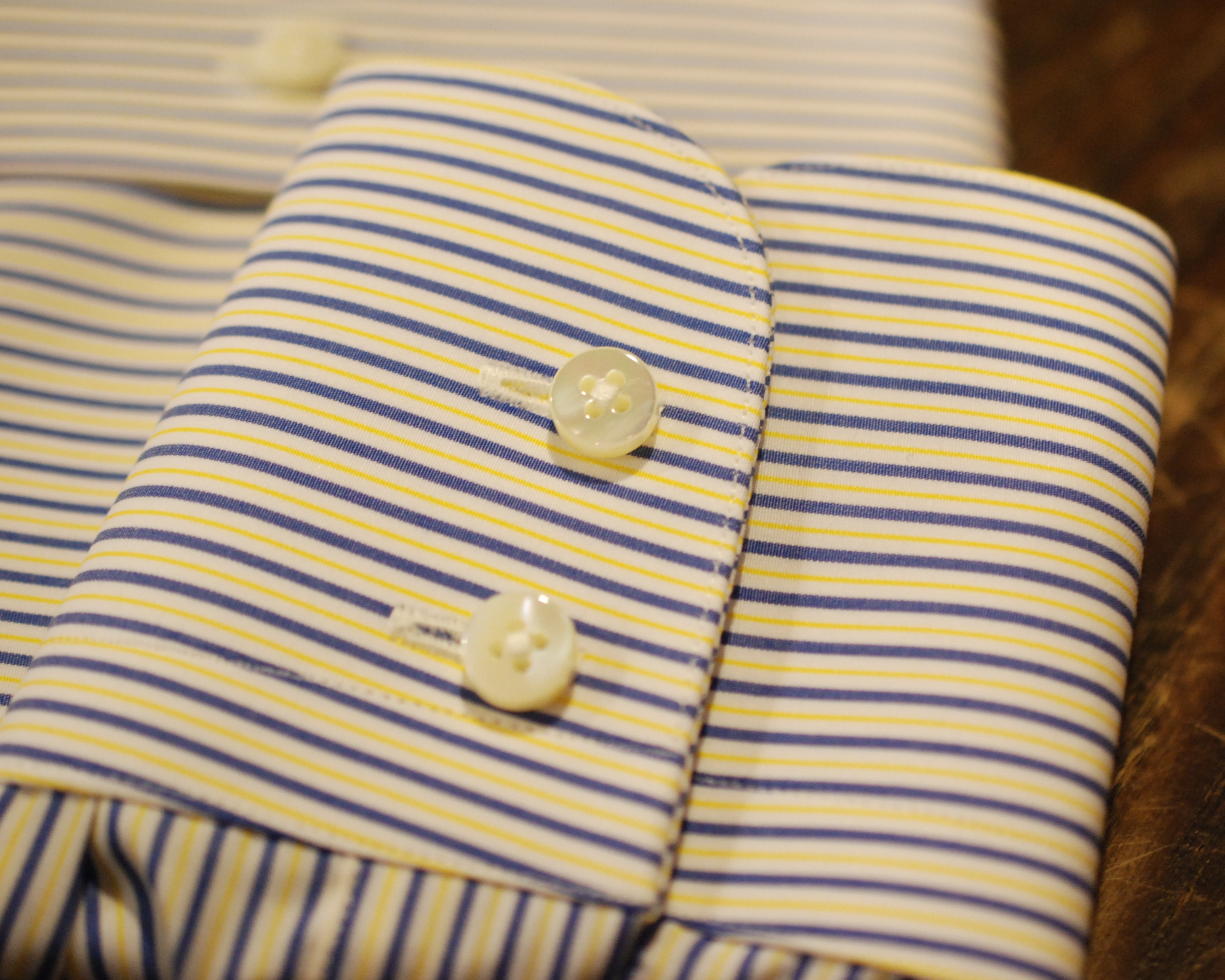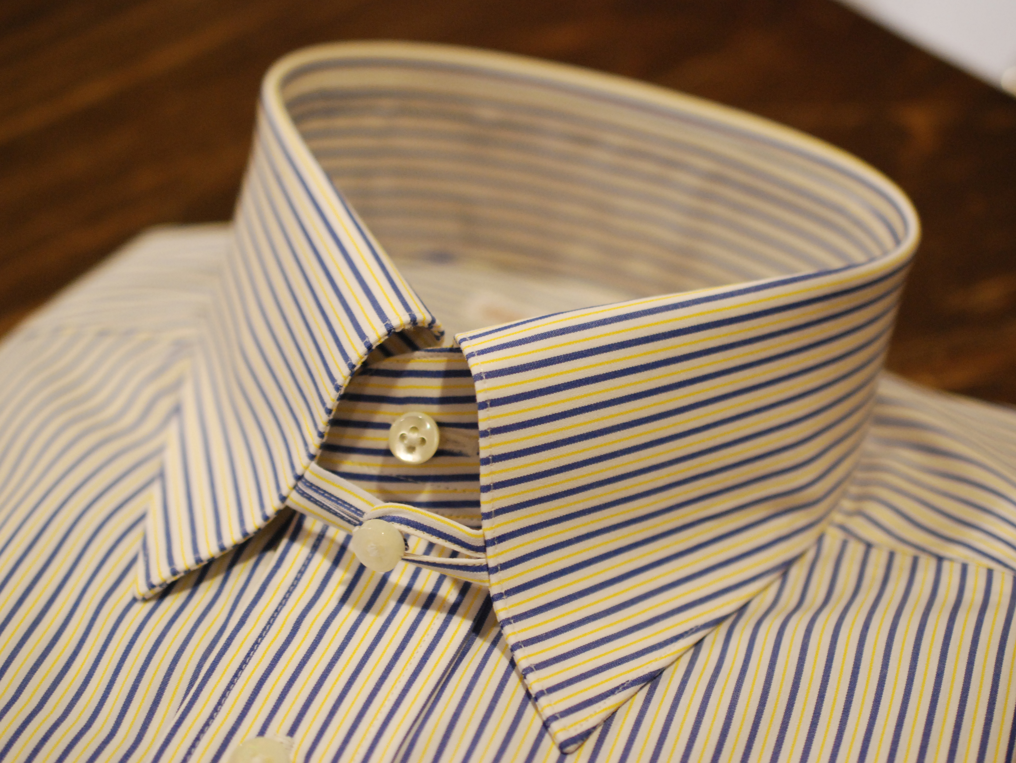 ブルー×イエロー×ホワイトのいかにも英国なオルタネイトストライプシャツ。