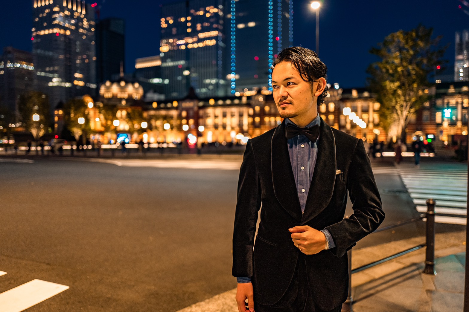 本来、タキシードは拝絹、側章が付く仕様になるのですが、