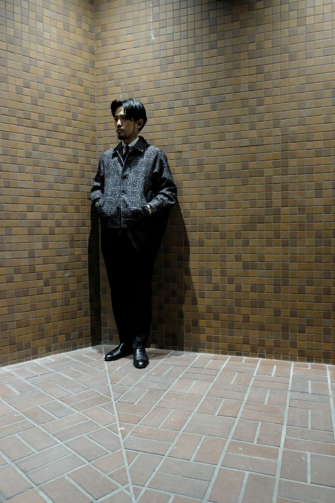 今回撮影で使用したハリントンジャケットはコート用の生地で制作したものです。