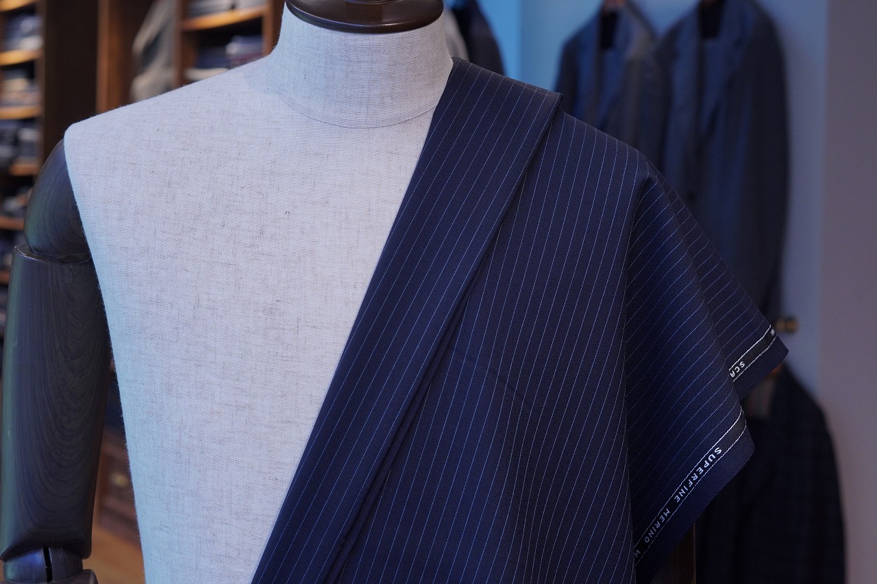 スタンダードなダークネイビーに8mm巾のブルーストライプを乗せた