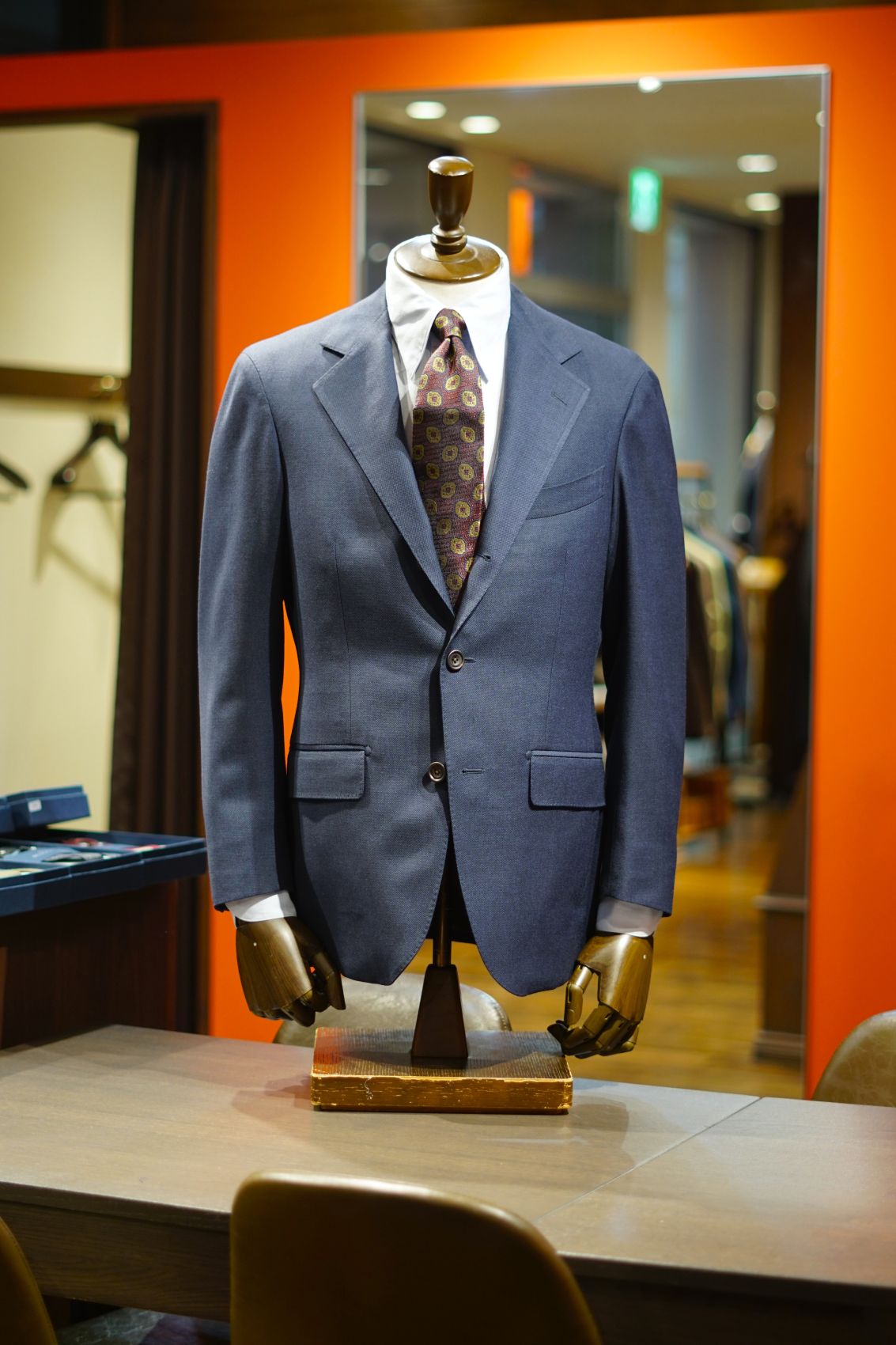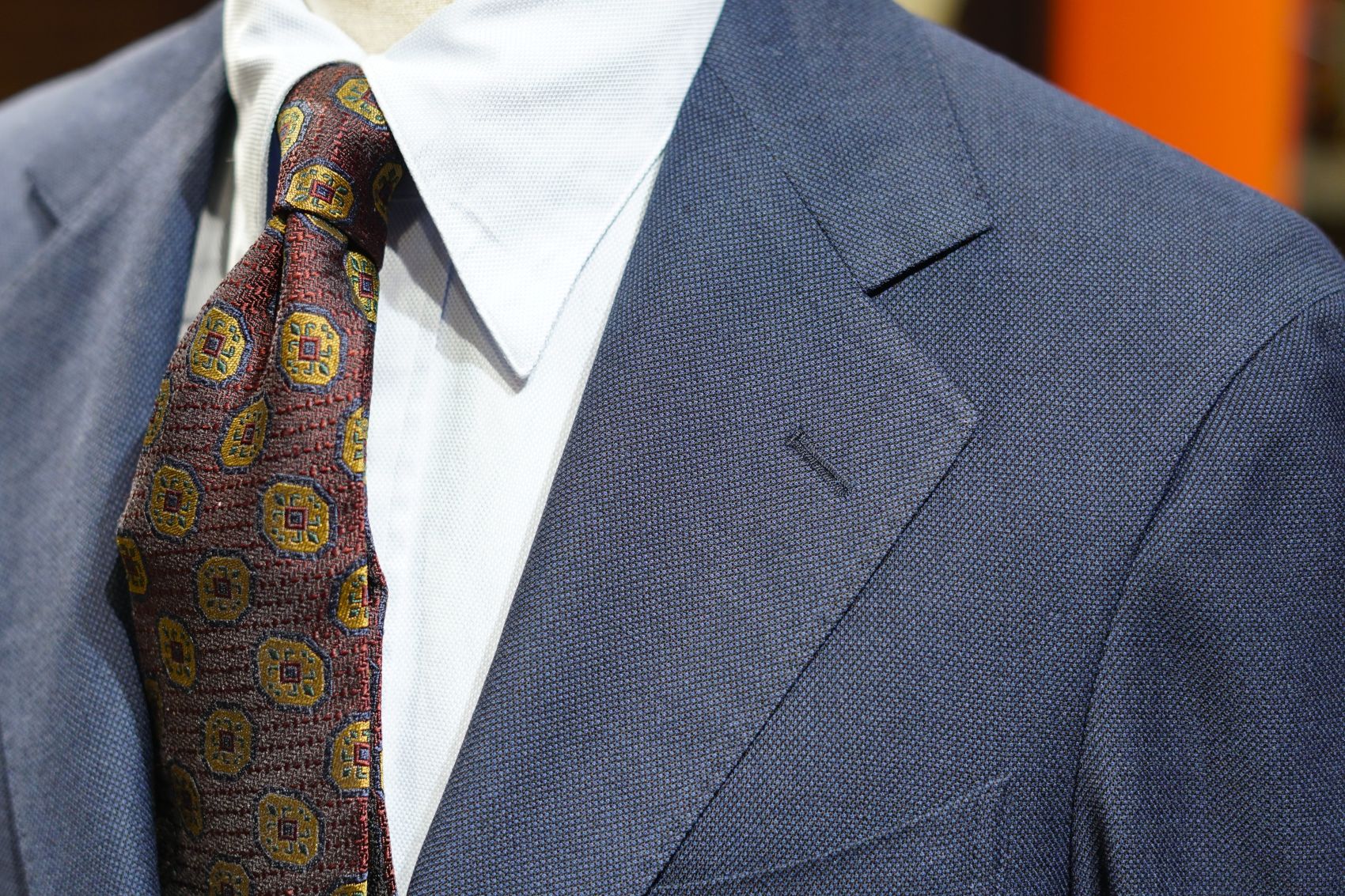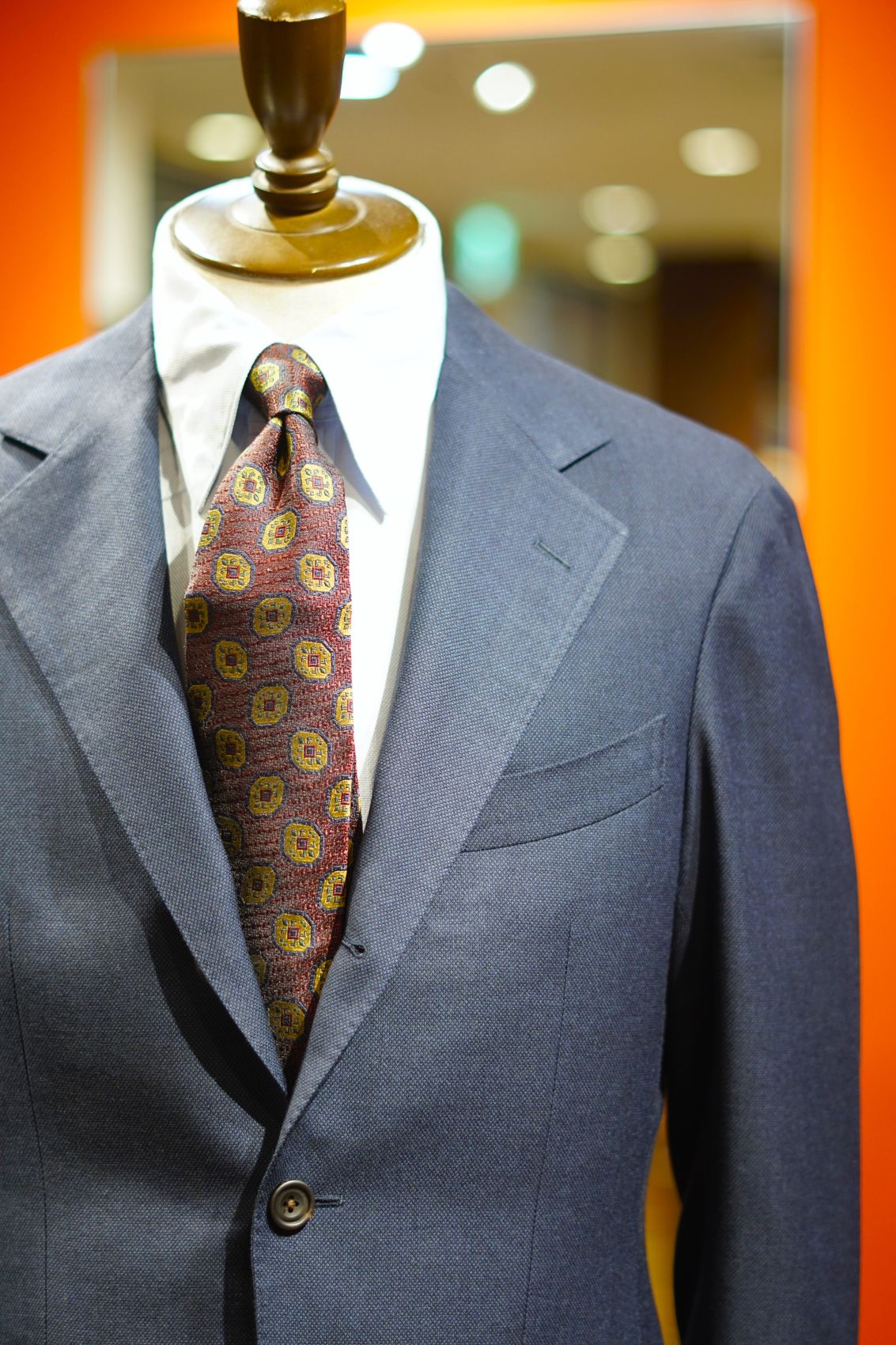 こちらのネクタイは赤みが強いですが、ソラーロ調になるため結ぶと色の変化がでます。