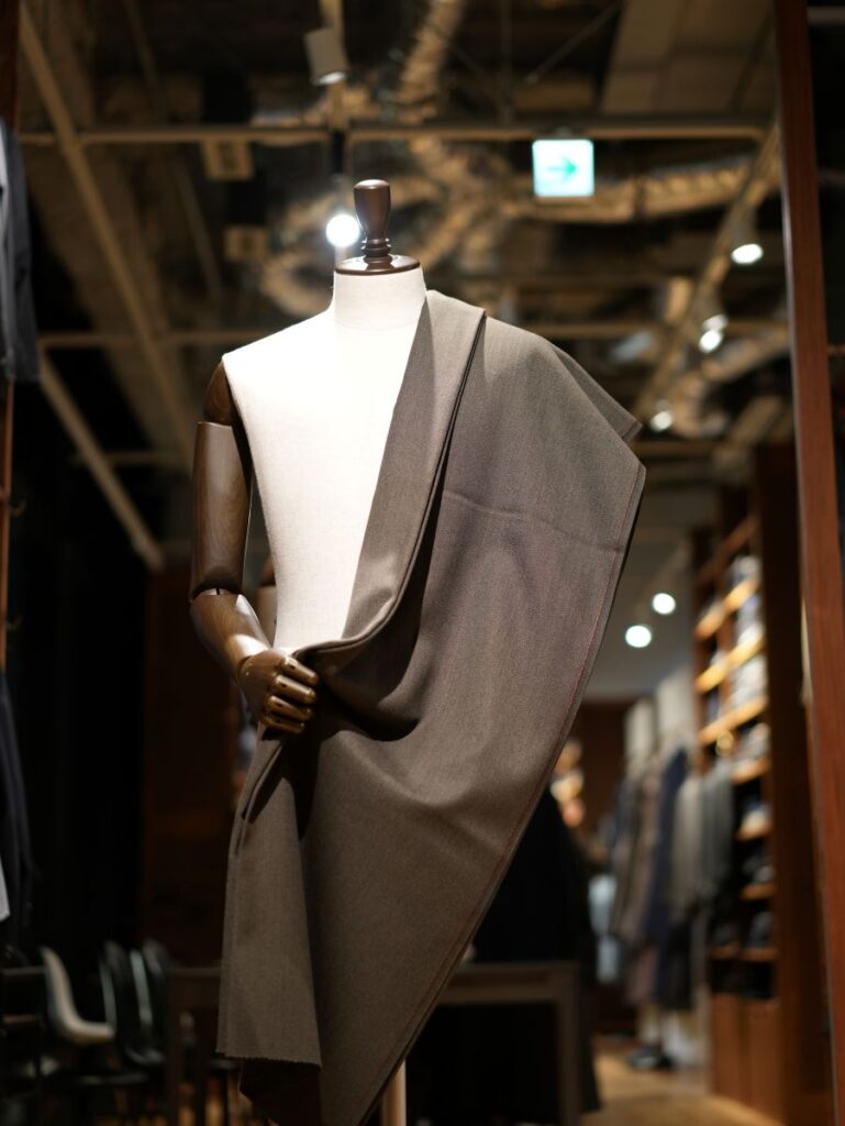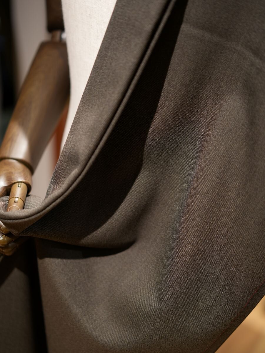 色ムラが出てスーツとしてもよいですが、セットアップ等でも楽しめる生地ですね。