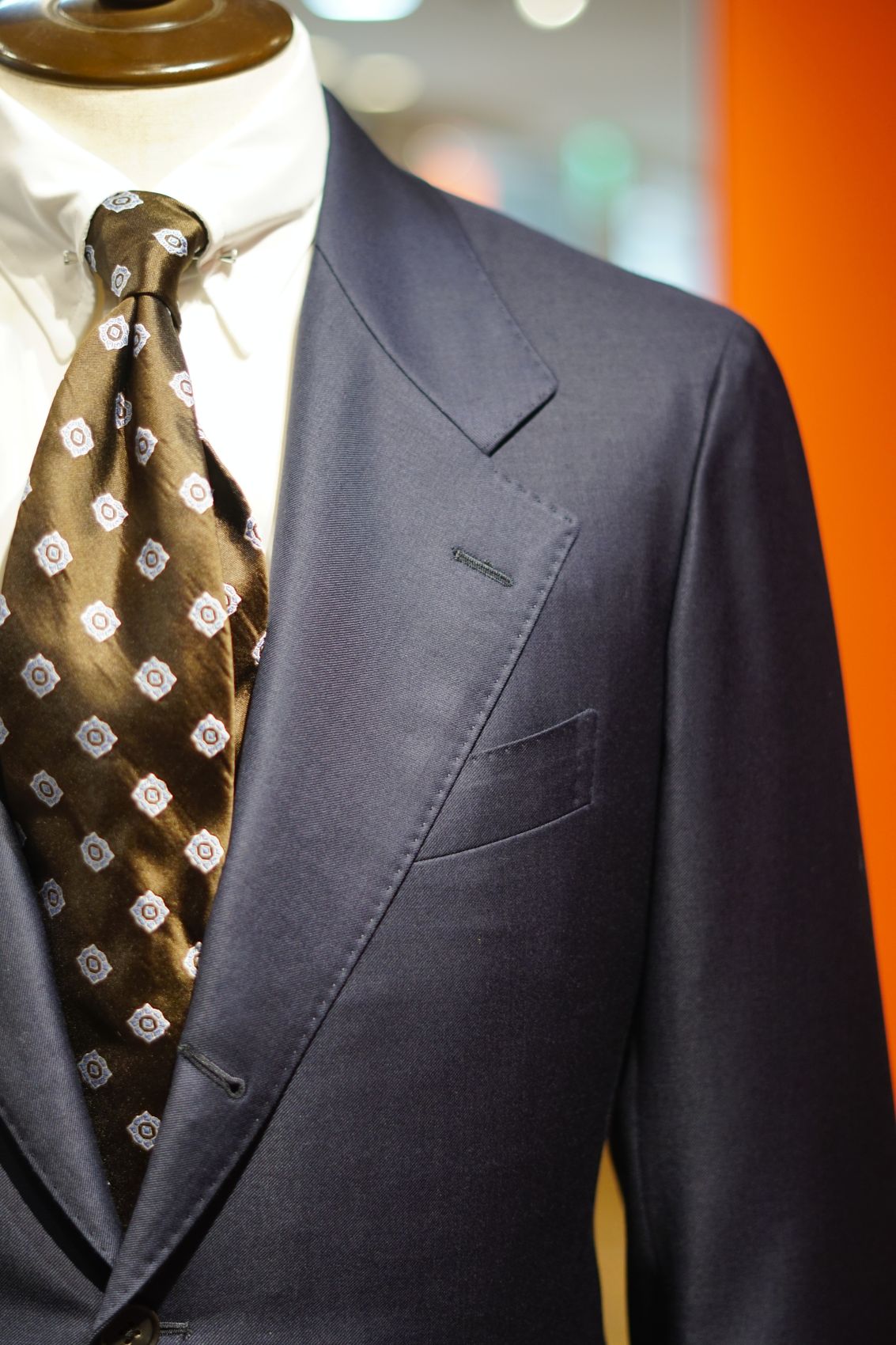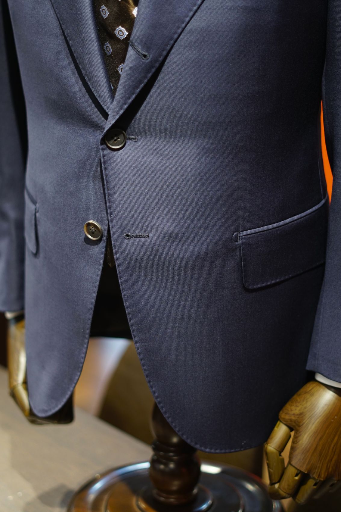 S160’sの美しい紺無地の生地で仕立てられた角台場は、ジャケットの内側からこだわりと品格を物語ってくれるでしょう。