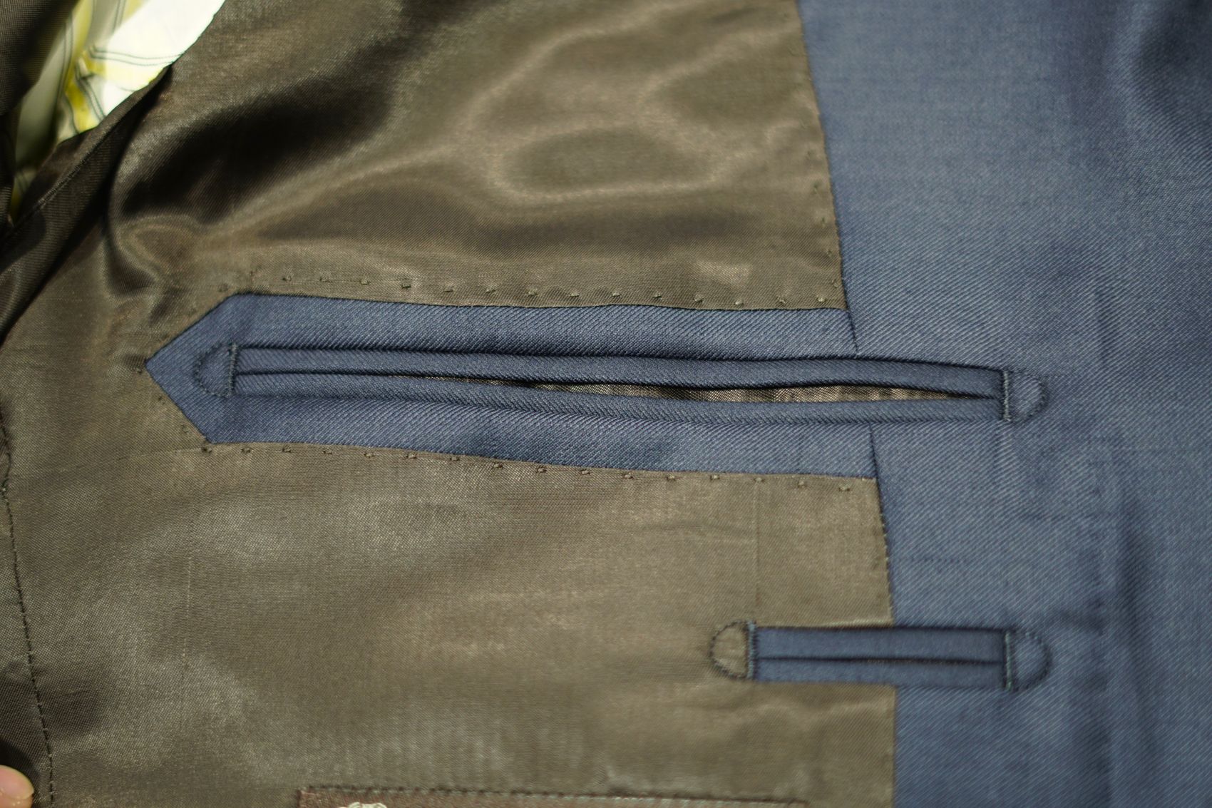 ポケットの玉縁(縁飾り)を支える内側の大きな補強布を、ジャケットの表生地と同じ形で角型に裁断し、美しく仕上げる伝統的なディテールです。