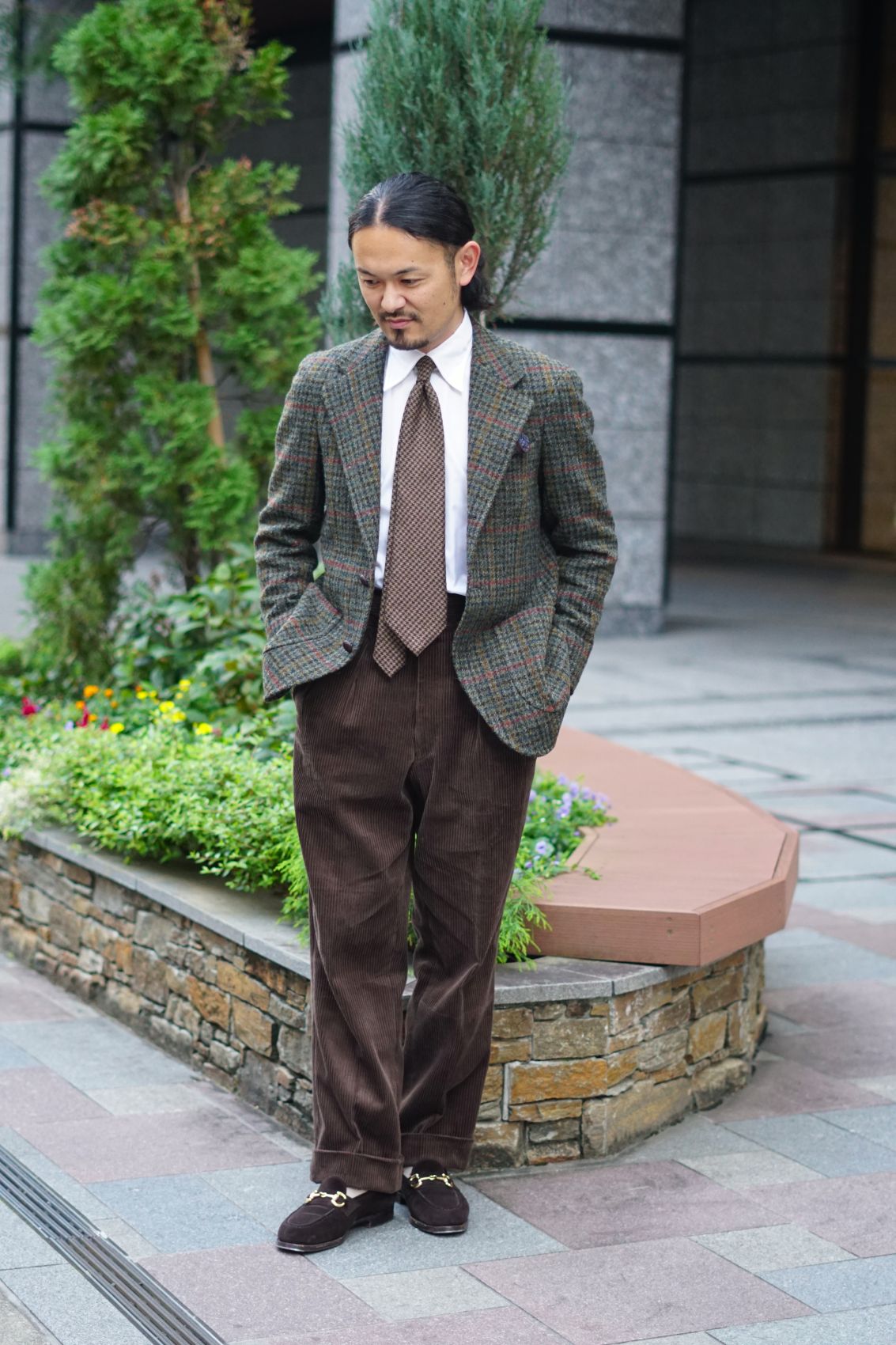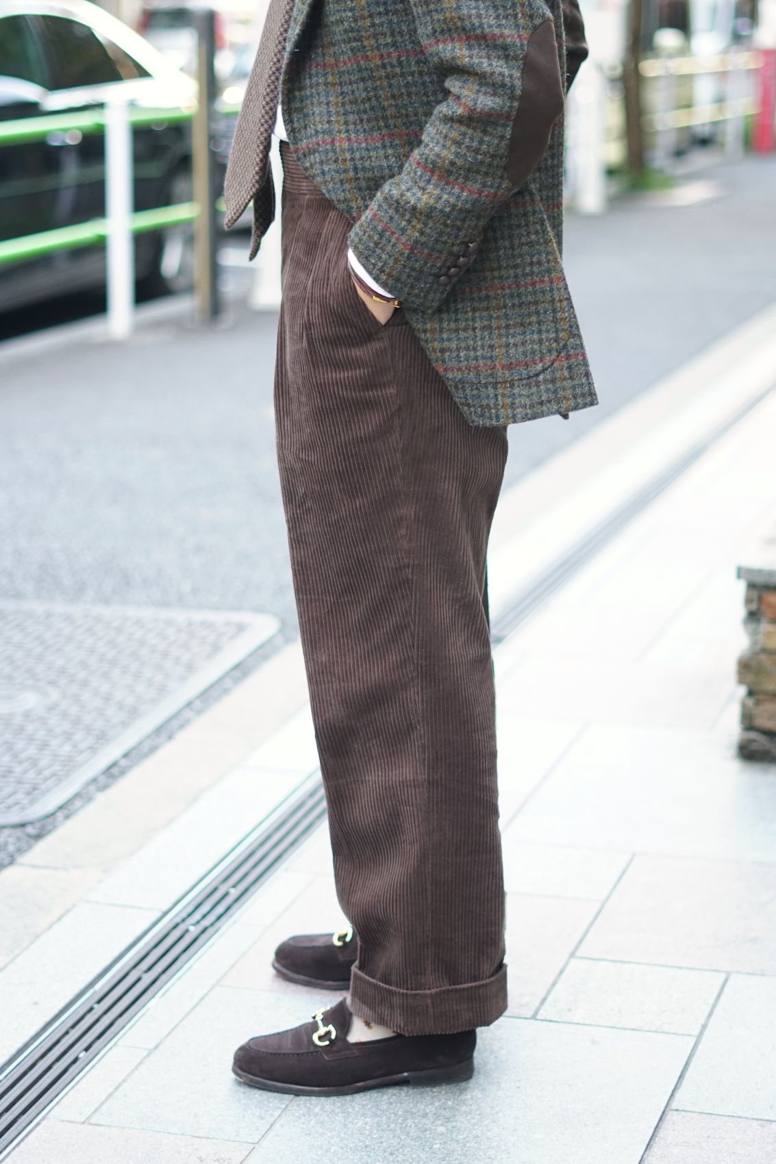 パンツの色と素材感に馴染むスエードのビットローファーを選択。重くなりがちなツイードとコーデュロイの組み合わせに、適度な軽快さと色気をプラスしています。
