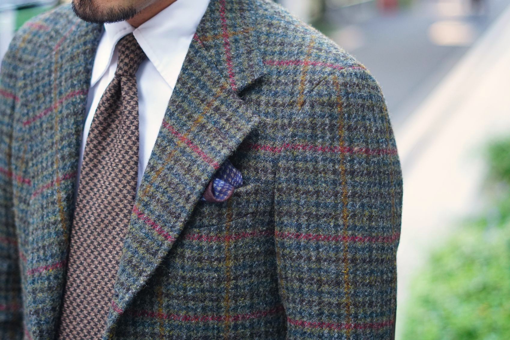 このツイードは、ベースの深いモスグリーンに、赤、青、黄色といった複数の色が複雑に絡み合い、写真から伝わるように立体的な奥行きを生み出しています。ただのチェック柄ではなく、自然の風景を閉じ込めたような深い表情が魅力です。