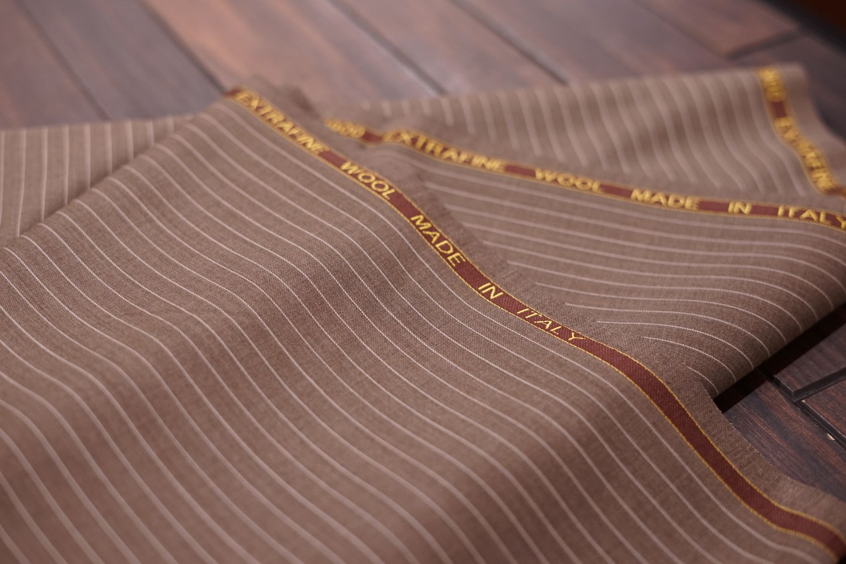 今回もトレーニョの生地になってしまいますが、柔らかいブラウンにピンストライプが走る色気のある生地が出てきました。